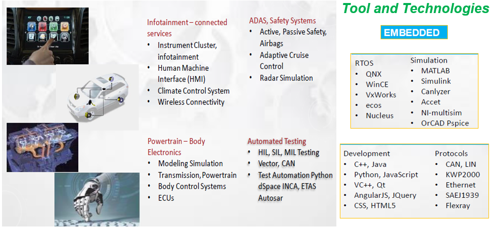We have expertise in delivering a wide range of services including BSP, device driver, firmware development. HB-SET offers talent solutions in areas of embedded electronic controls, modelling and simulation with qualified resources for product development and engineering services to automotive OEMs and suppliers for their automotive electronics with following design solutions.